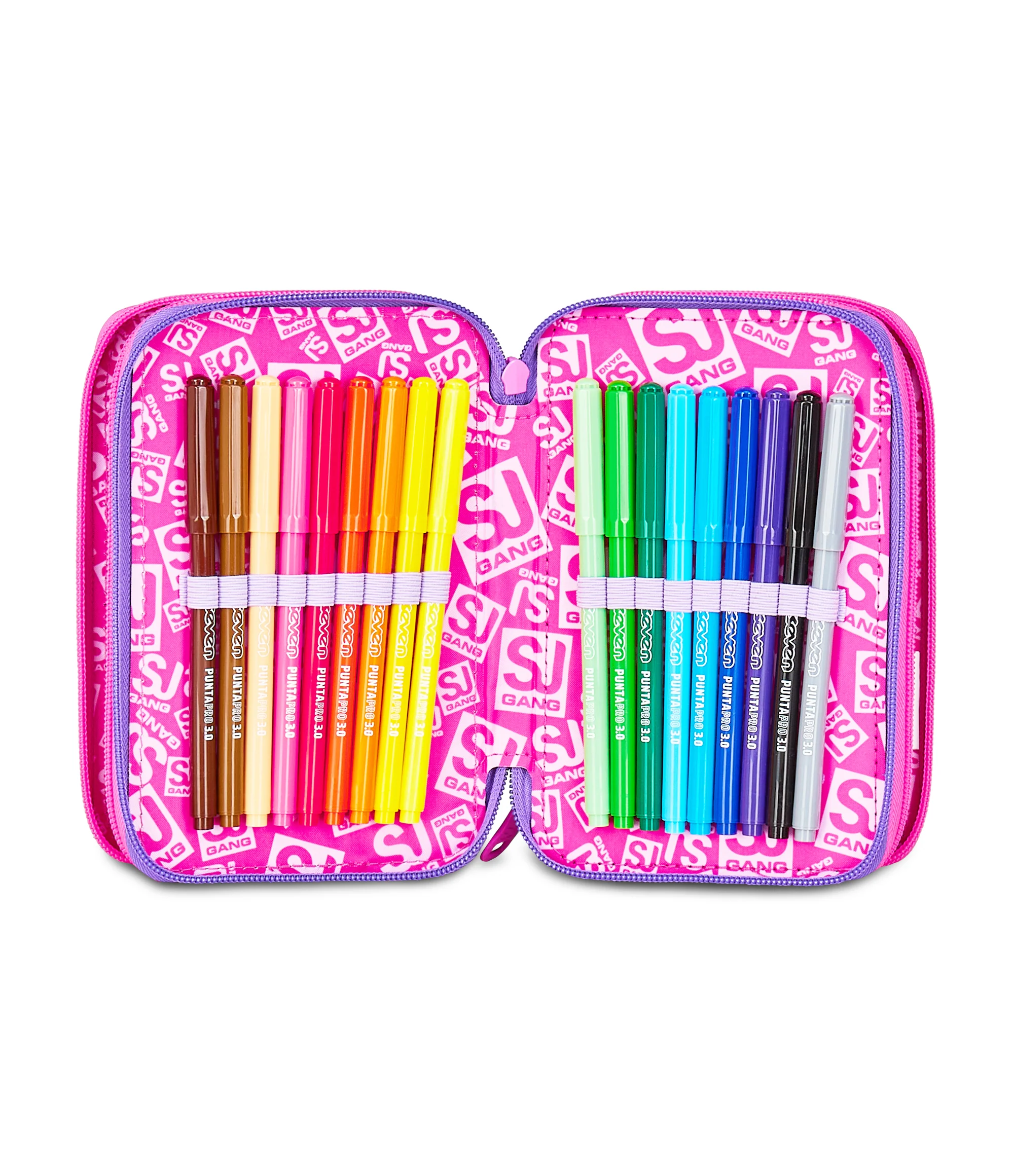 Ciao! Sono il coloratissimo Astuccio 3 zip SJ Gang. Dotato di 3 scomparti completi di tutto il materiale necessario per fare al meglio i tuoi lavori di scuola, puoi abbinarmi a uno zaino SJ Gang.