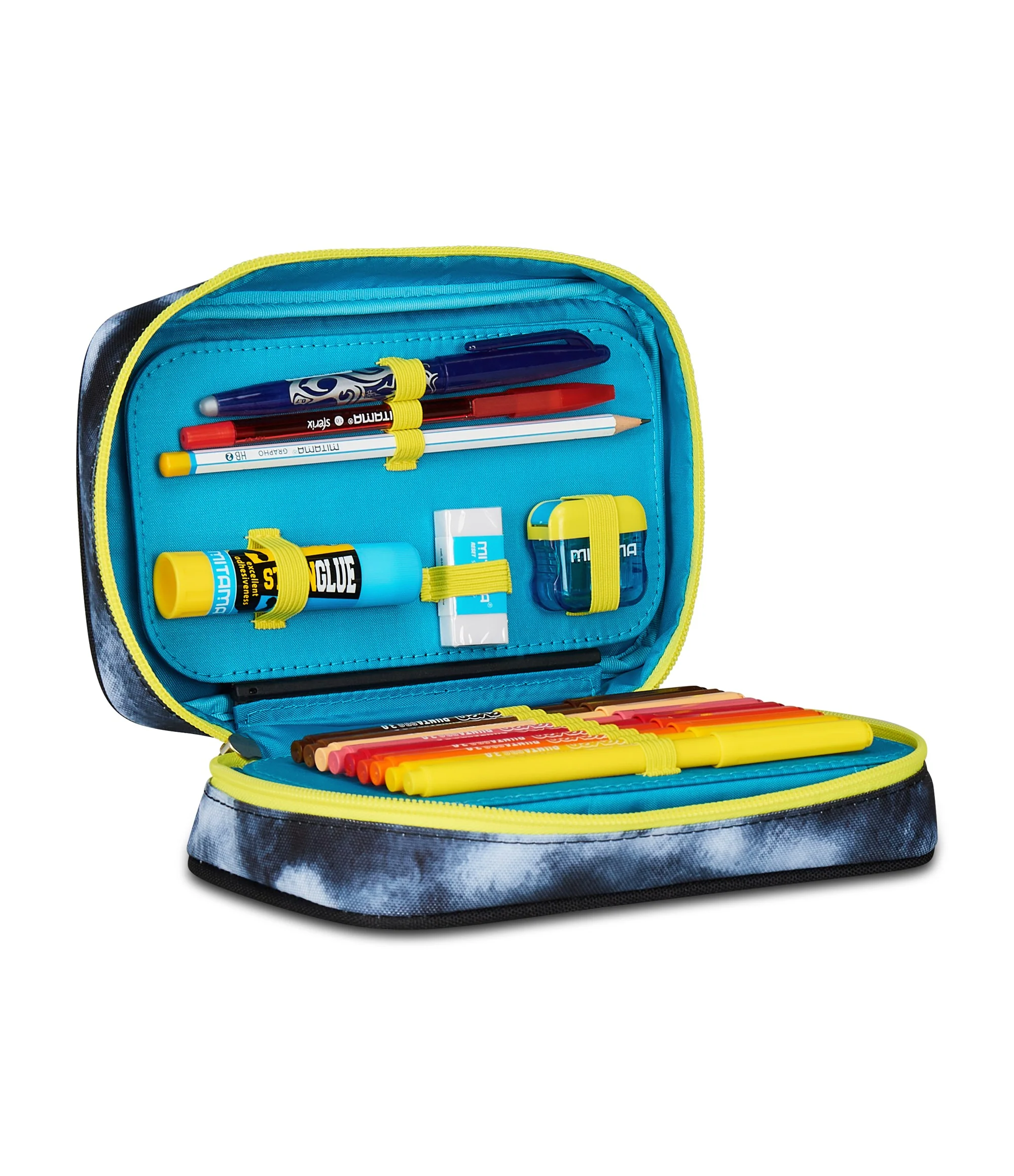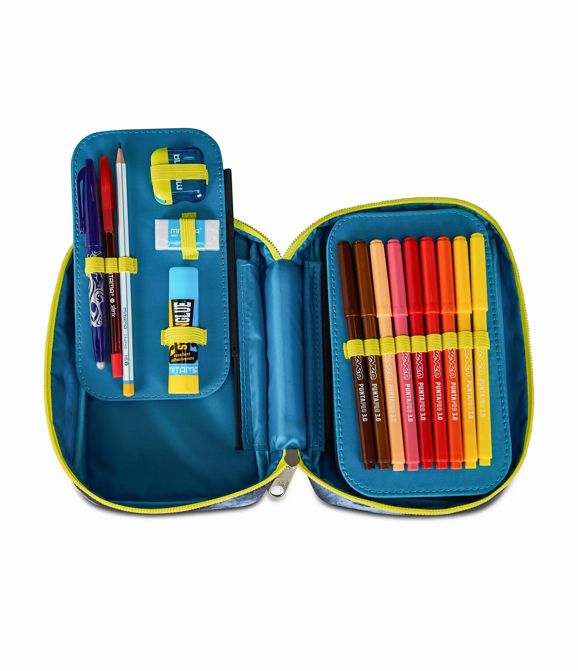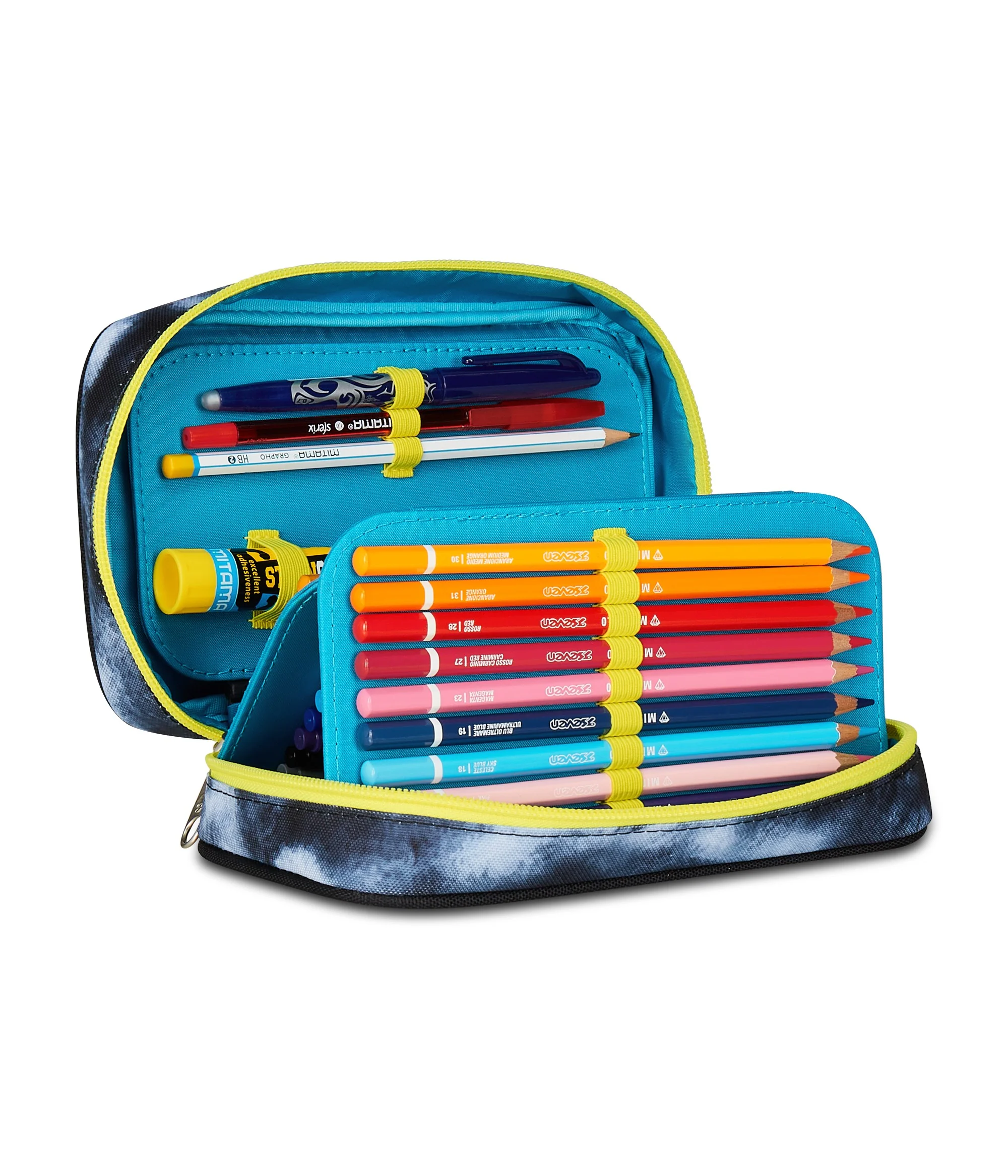 Apertura singola, plance amovibili ed elastici interni per cancelleria. CONTENUTO 45 PEZZI: 1 penna cancellabile blu, 1 penna sfera rossa, 18 pastelli a colori 4.0 esagonali, 18 pennarelli superlavabili punta 3.0, 1 matita grafite esagonale HB, 1 colla gialla azzurra, 1 gomma bianca con cartoncino stampato, 1 temperino barilotto 2 fori, 1 righello trasparente, 1 matita bicolor rosso/blu, 1 paio di forbici in metallo