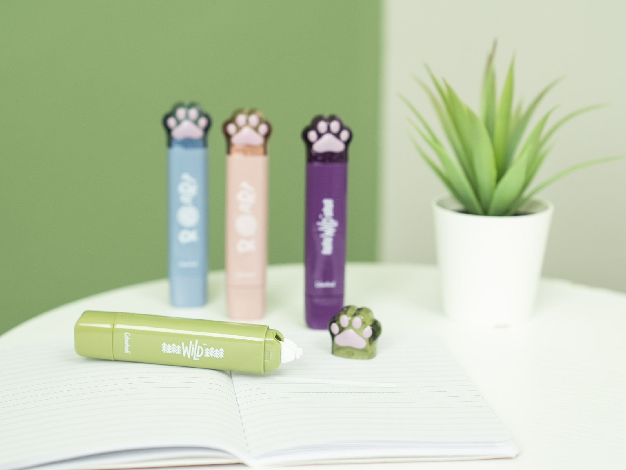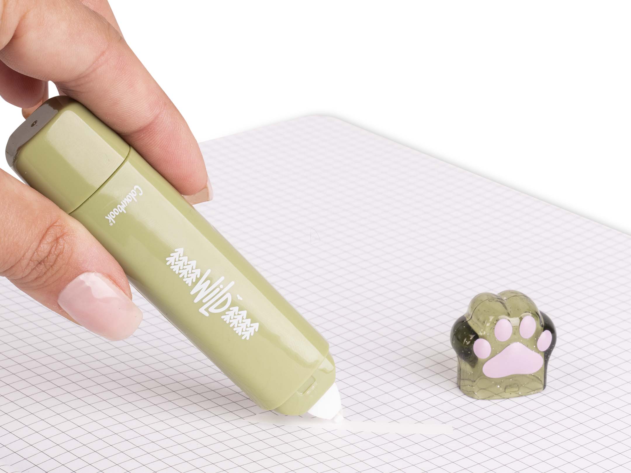 Da un lato un correttore a nastro, dall’altro una testina che rilascia una striscia di colla: il tutto racchiuso in due coloratissime zampette glitterate.