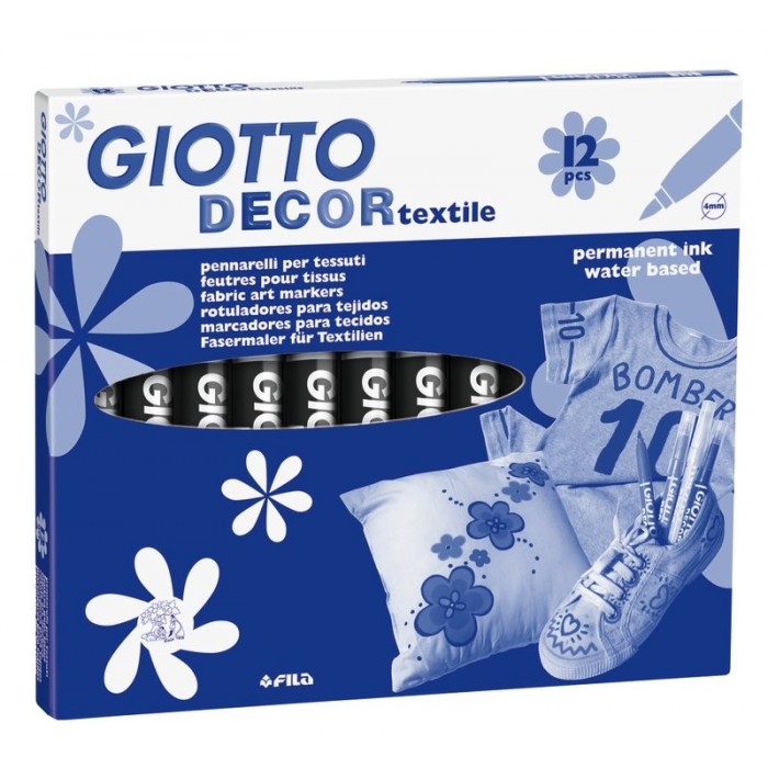 Fashion style autoprodotto. Trasforma il tuo stile, personalizza e reinterpreta tshirt, jeans o sneackers con Giotto Decor Textile! Espressione creativa da indossare, i pennarelli speciali decorano qualsiasi tipo di tessuto e sono disponibili in 8 colori classici e 4 fluorescenti, tutti a resa permanente e resistenti a lavaggi in lavatrice a 40°. A base acqua, atossici e sicuri, facilmente lavabili dalle mani, sono dotati di una speciale punta a pennello ideale per i tessuti, di un pennino bloccato, tappo di sicurezza e cappuccio ventilato. Si consiglia di passare il ferro da stiro tiepido sul decoro, per fissare il colore.