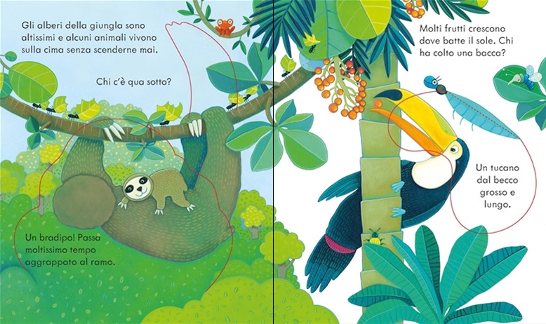 Un bellissimo libro con tante alette da sollevare per sbirciare tra le fronde degli alberi e per esplorare questa giungla pullulante di vita. Le illustrazioni, splendide e intriganti, sono accompagnate da brevi ma interessanti informazioni sugli animali e le loro abitudini.
