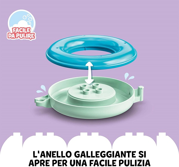 I bambini ameranno giocare con questo tenero panda nell’acqua, potranno lavarlo con il secchio, che si adatta perfettamente all’anello, mentre il panda si concede una nuotatina. Un gancio arrotondato permette di collegare l’anello galleggiante agli anelli dei set (venduti separatamente) Ora del bagnetto: Treno degli animali galleggiante 10965 e/o Ora del bagnetto: Isola degli animali galleggiante 10966. Inoltre, l’anello si apre per facilitare il risciacquo e garantirne l’igiene, bagnetto dopo bagnetto