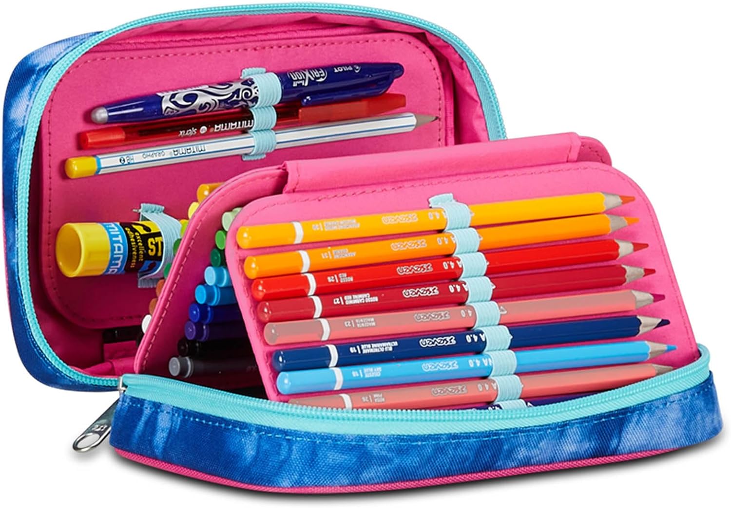 Infatti, all’interno, ha plance con elastici porta penne e matite, che puoi rimuovere del tutto, permettendo in questo modo il lavaggio dell’astuccio.