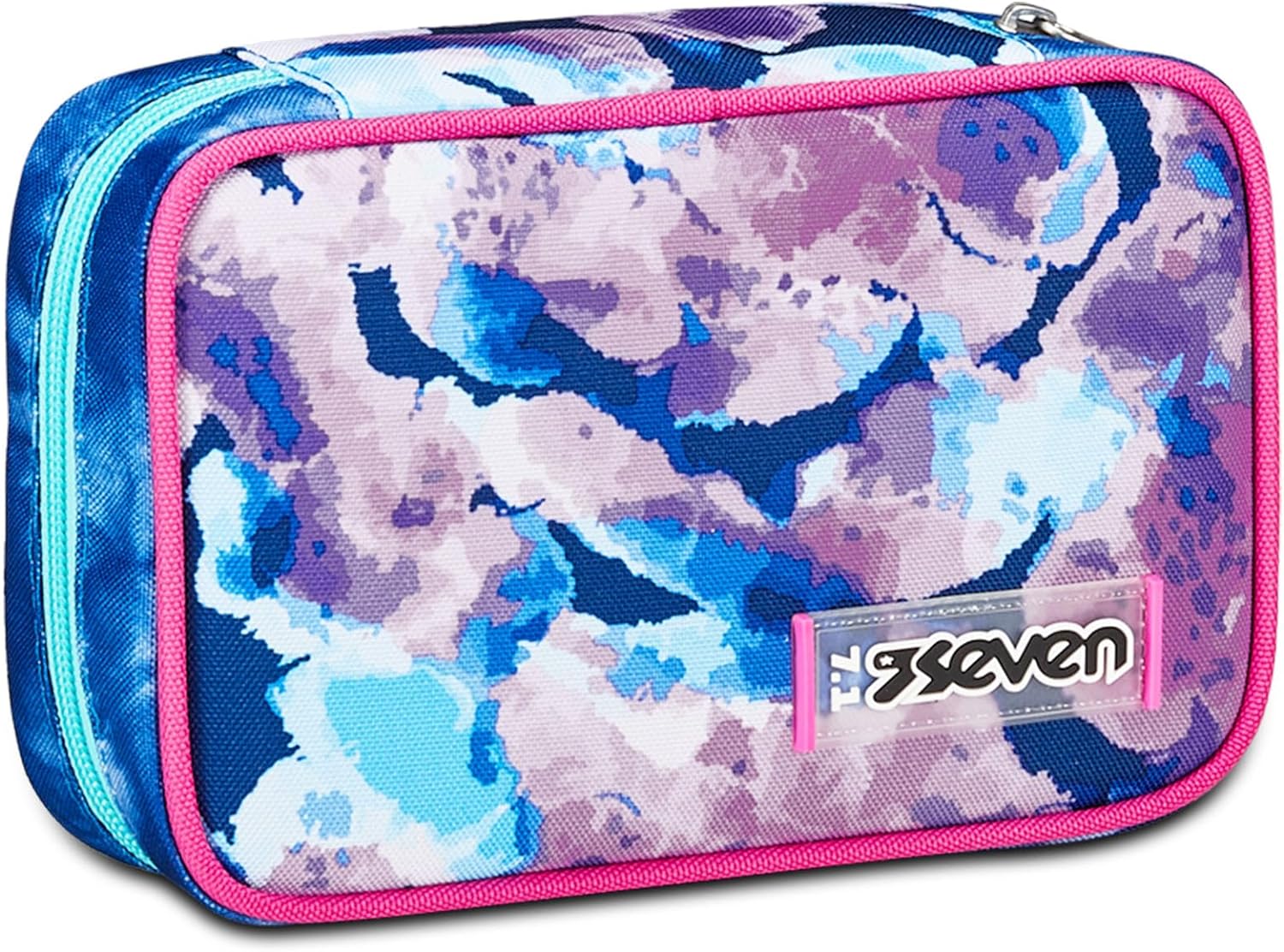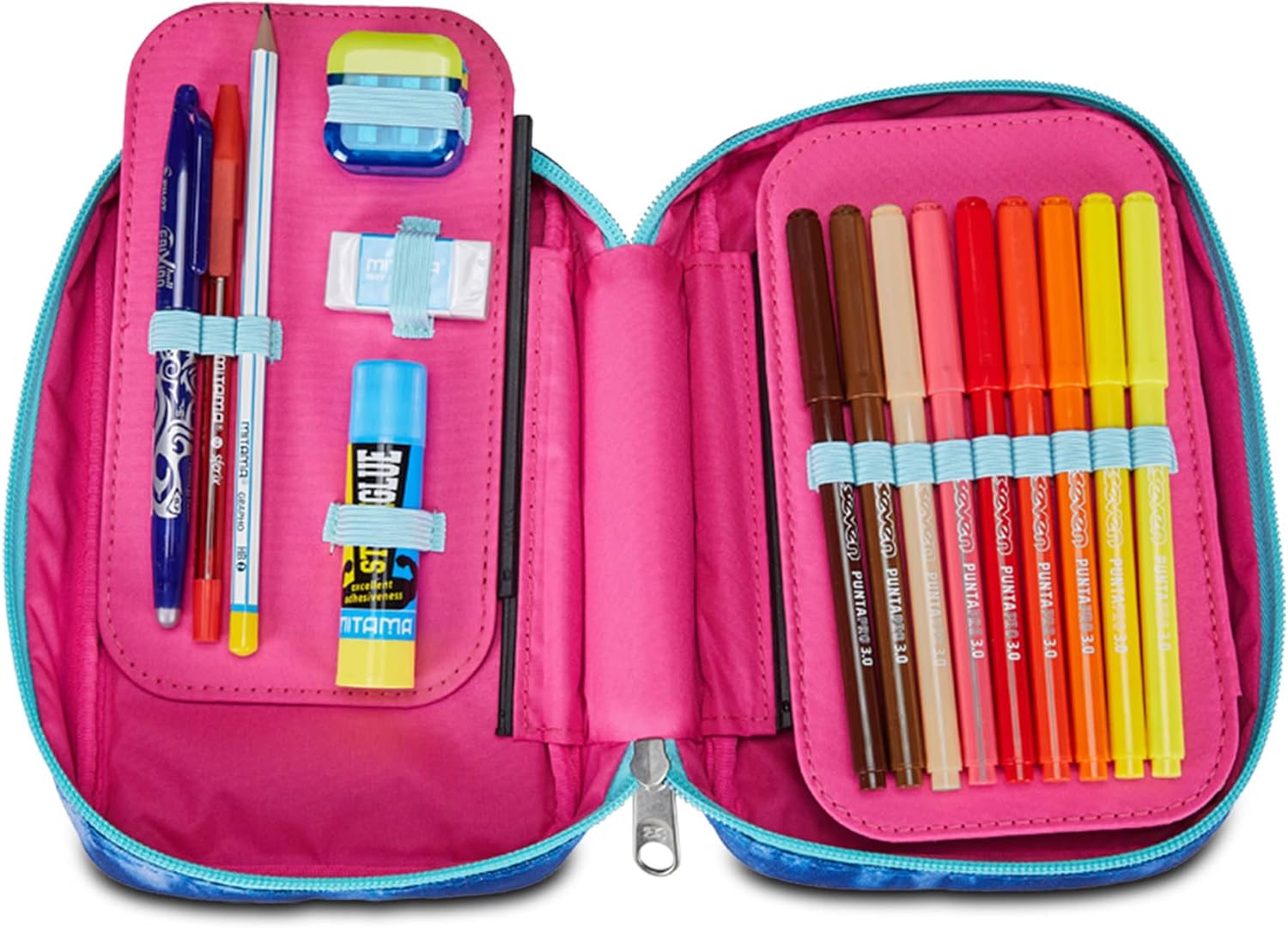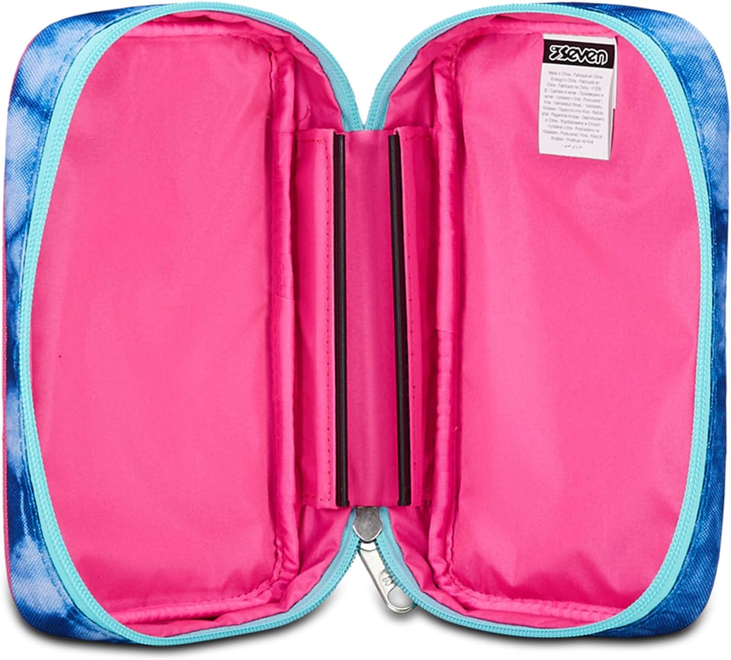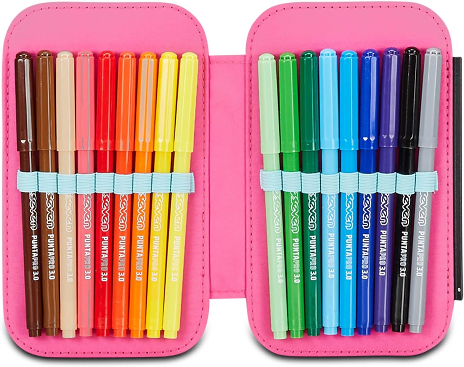 Apertura singola, plance amovibili ed elastici interni per cancelleria. CONTENUTO 44 PEZZI: 18 Pastelli a colori mina 4.0 Seven, 18 Pennarelli lavabili Seven, 1 Penna cancellabile blu, 1 Penna cancellabile rossa, 1 Matita grafite, 1 Gomma, 1 Temperino barilotto a 2 fori, 1 Colla stick, 1 Righello trasparente, 1 Forbice in metallo con maniglia in plastica.