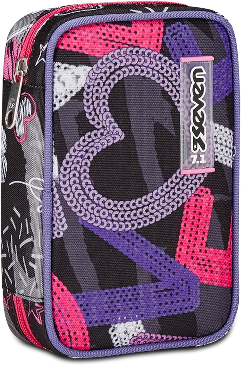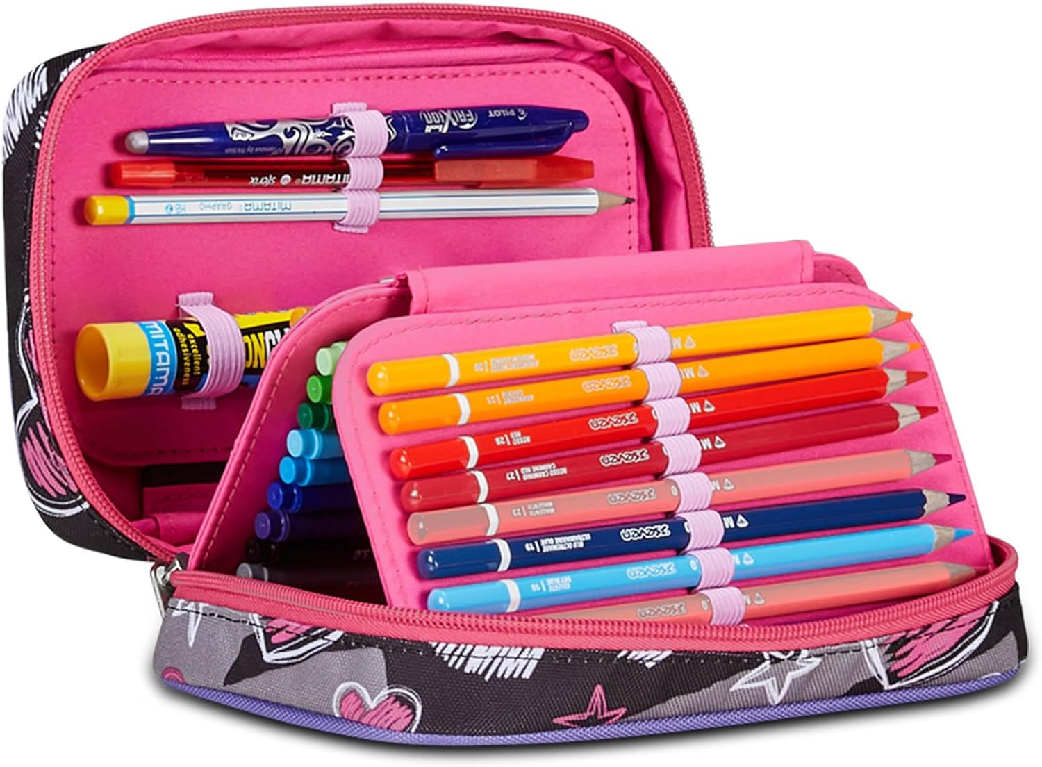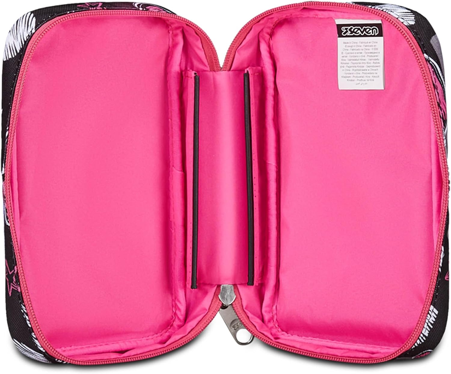 Apertura singola, plance amovibili ed elastici interni per cancelleria. CONTENUTO 44 PEZZI: 18 Pastelli a colori mina 4.0 Seven, 18 Pennarelli lavabili Seven, 1 Penna cancellabile blu, 1 Penna cancellabile rossa, 1 Matita grafite, 1 Gomma, 1 Temperino barilotto a 2 fori, 1 Colla stick, 1 Righello trasparente, 1 Forbice in metallo con maniglia in plastica.