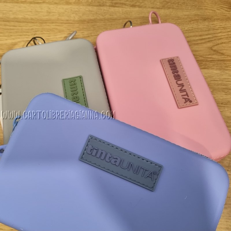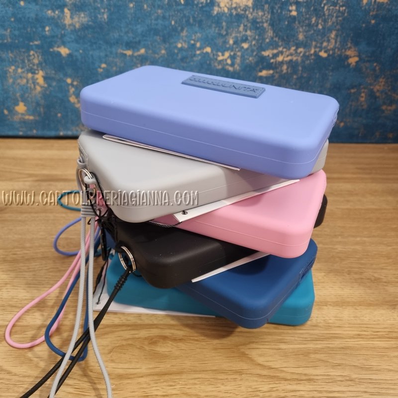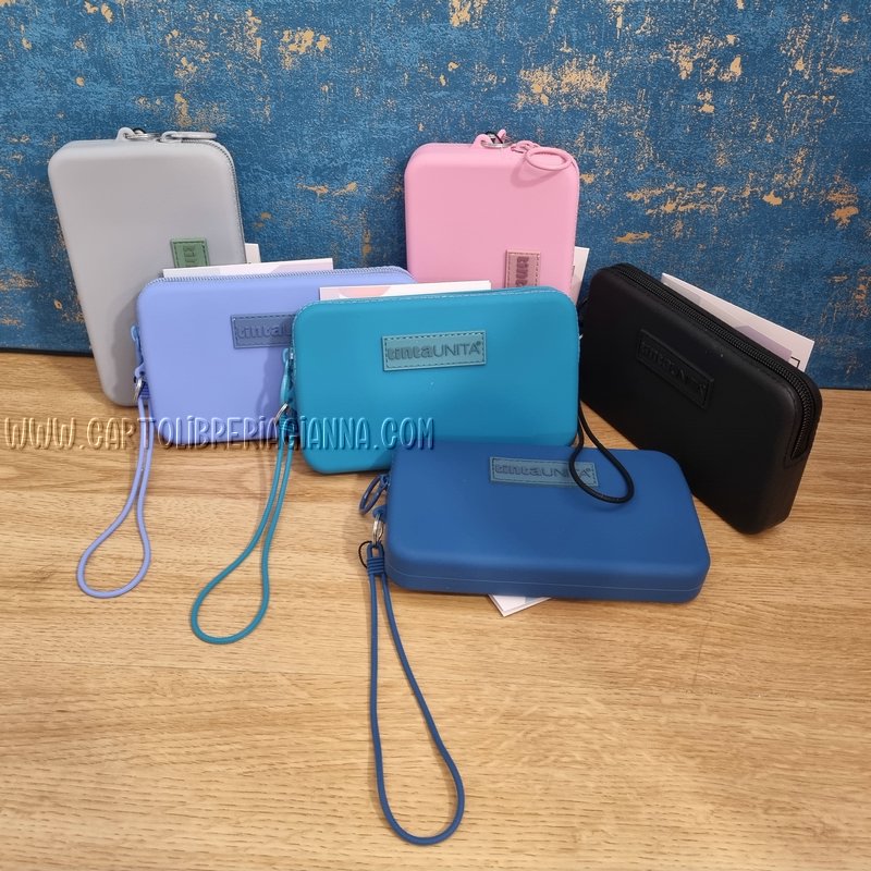 Busta rettangolare con laccetto da polso in silicone soft touch, sempre a portata di mano.