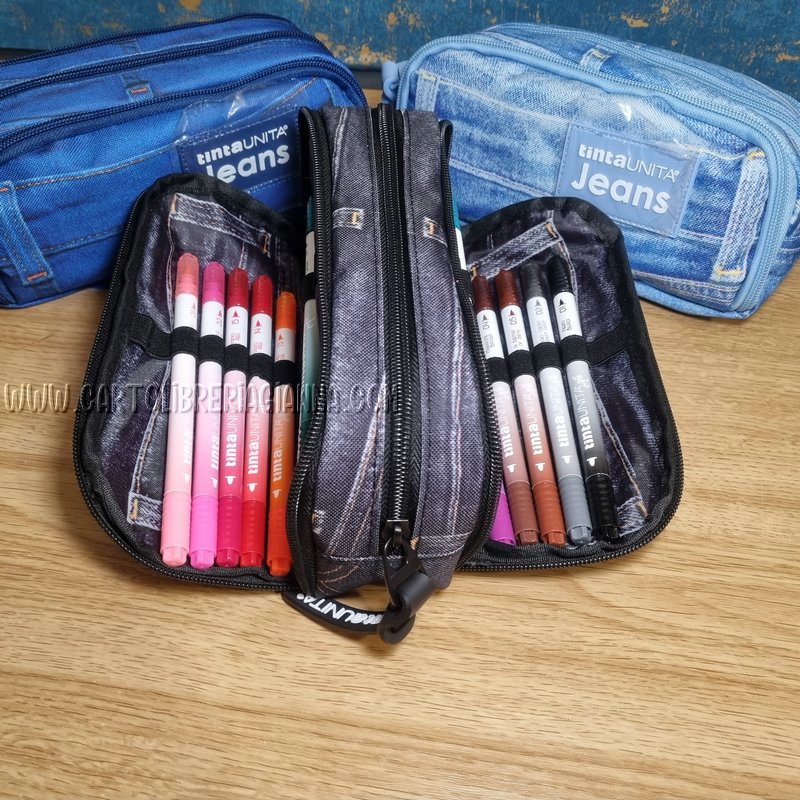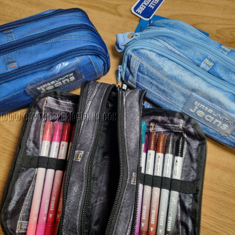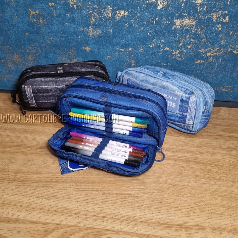 Tre tasche: due con elastici dotate già di pennarelli e una tasca per gli accessori.