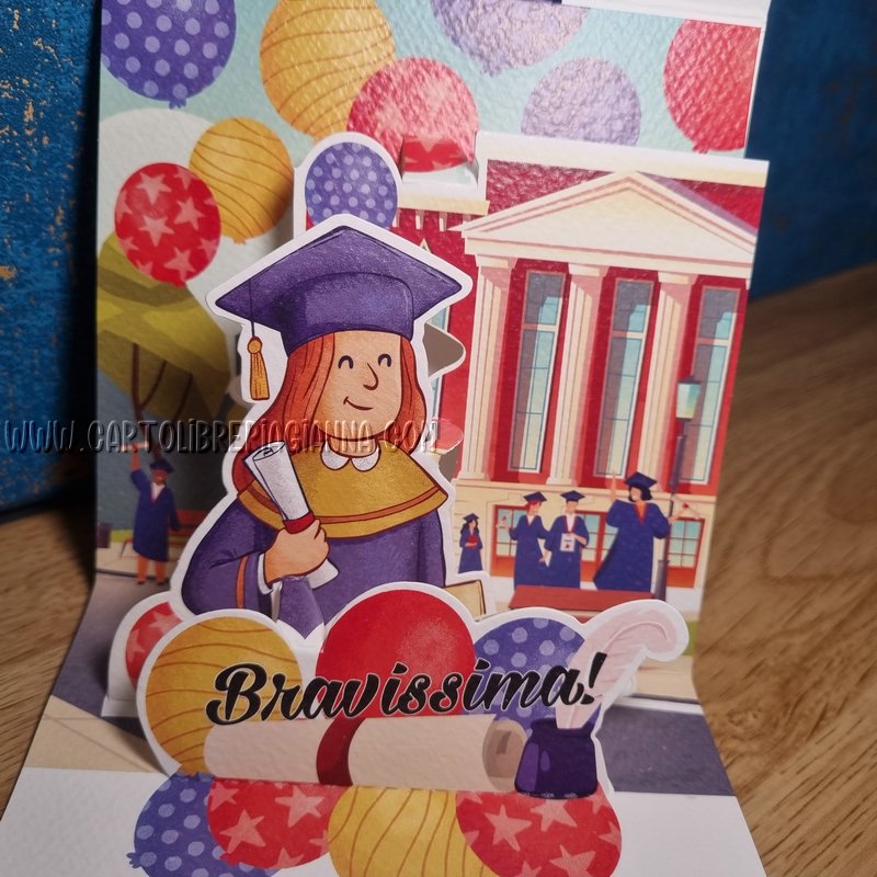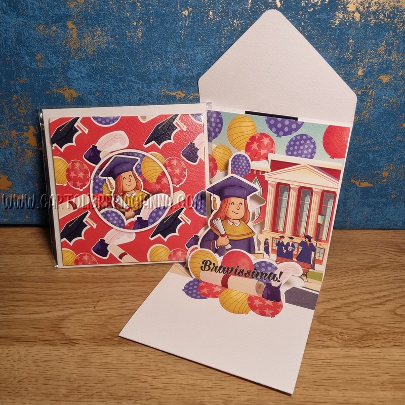 L’originale chiusura “a busta”, rivela all’apertura un pop-up bidimensionale che sorprende il festeggiato!