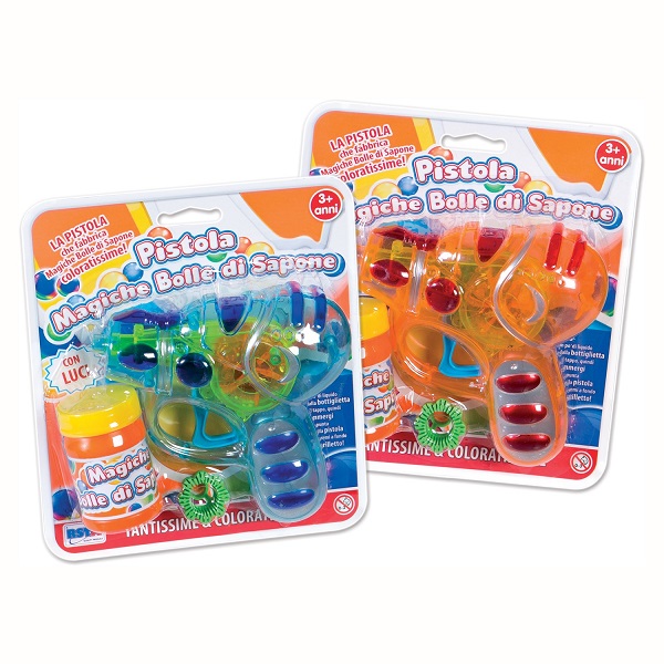Pistola che fabbrica mille bolle di sapone coloratissime, con luci.