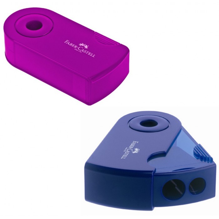 Temperamatite ergonomico SLEEVE, a due fori, con serbatoio e meccanismo a scorrimento.