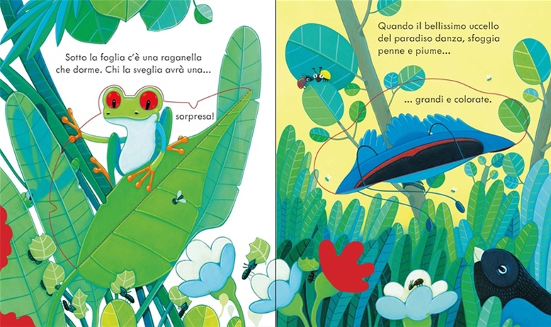 Un bellissimo libro con tante alette da sollevare per sbirciare tra le fronde degli alberi e per esplorare questa giungla pullulante di vita. Le illustrazioni, splendide e intriganti, sono accompagnate da brevi ma interessanti informazioni sugli animali e le loro abitudini.